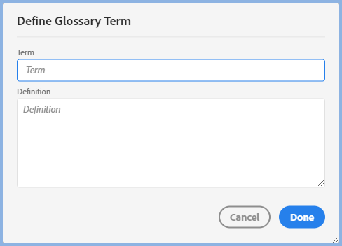To create a term, expand the glossary by clicking the right chevron and click the + icon again to enter the term name and the definition.