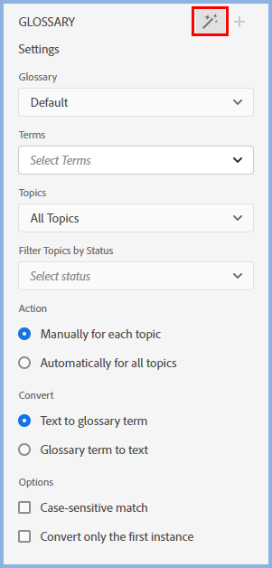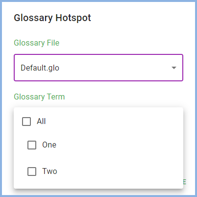The glossary panel has a toggle icon for the Glossary Hotspot Tool to reveal the options.
