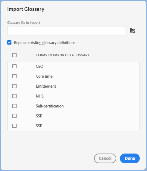 There is a check box allowing you to leave existing definitions in an existing glossary or replace them and you can select which terms to import.