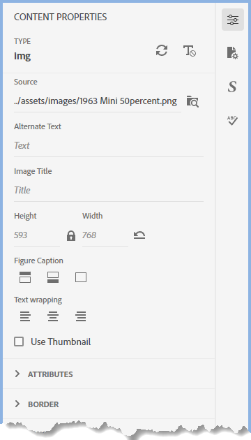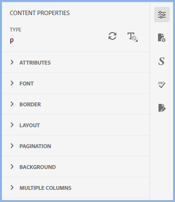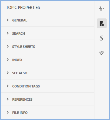 - Depending on what has focus, 4 will display relevant options. In this example the top icon on the right has focus so the Content Properties of whatever has focus in the content are shown. The other icons access the Topic Properties, the Styles, the Spell Check and Track Changes.