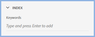 Index Index keywords can be added in the Index Editor on the Project toolbar or entered here. Just add the keyword and press Enter. The Index Editor lets you remove a keyword from just one topic or all topics. Here you can click X to just remove it from the topic whose properties you are reviewing.