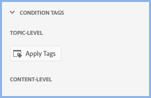 Condition Tags Condition tags can be added to a topic here, just click Apply Tags. Content Condition Tags are applied by selecting content and then right clicking to open a dialog to set the tag. The tags set for content are then shown here.