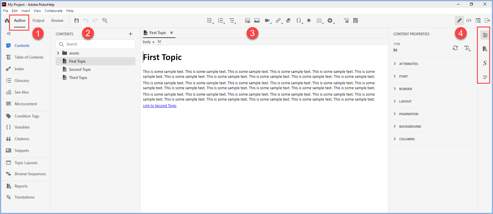 - On opening a topic, it appears in the authoring area 3. With multiple topics open, you can right click for various Close options or to locate a topic in the TOC.