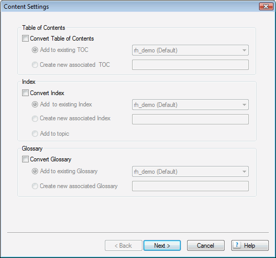 If the document being imported has a table of contents, an index or a glossary, you have the option of importing it. You can import it into its own TOC, index or glossary or you can add it to an existing one.