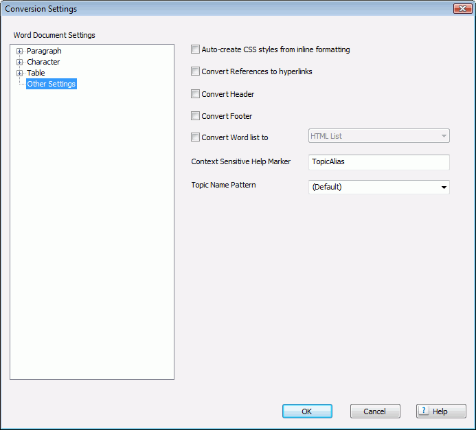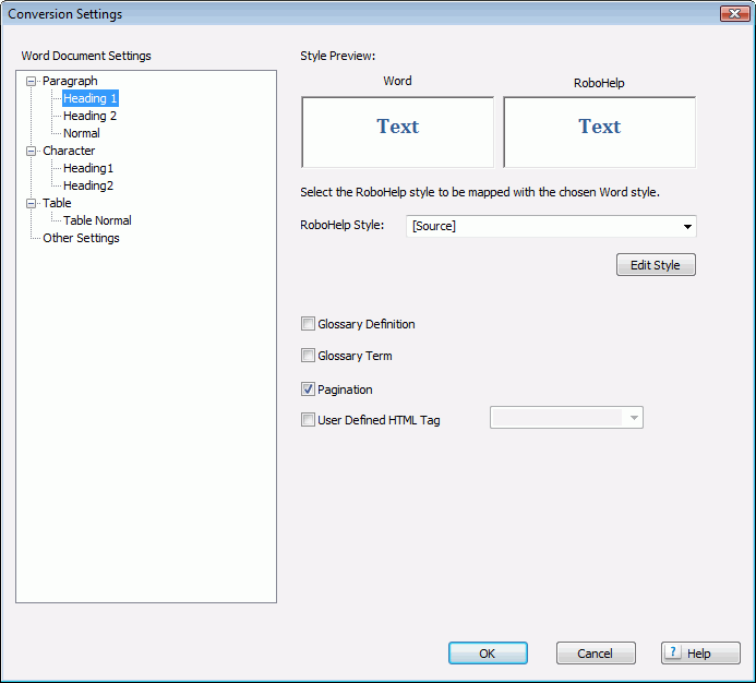 - If you are not using previously saved settings, click the Word Document Edit button and create the settings you want. Use the pagination check box to determine which styles determine how new topics are created. OK those settings.