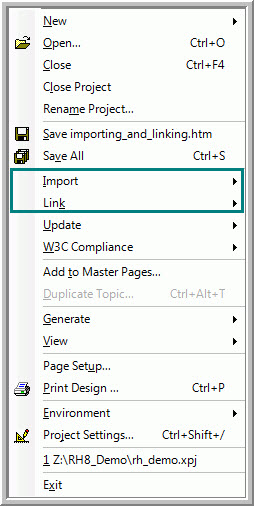 In RoboHelp 8, importing a document has changed and there is a new option to link to a document. Both options handle Word and FrameMaker documents, import also allows you to import PDF files.