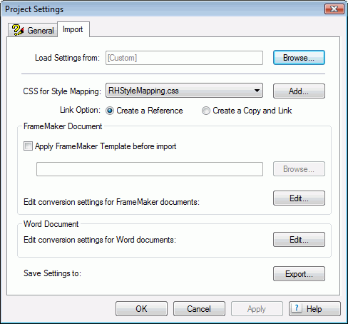 The source document will be copied into the project folders on your hard disk. Editing will be normally be done in the source application (Word or FrameMaker) but you can also edit in RoboHelp. When you generate the help, you will be prompted and you can update the RoboHelp topic or leave it out of sync if required. If you move the project, for example from your desktop to your laptop, the link will need to be repaired. The document will show as a broken link. |