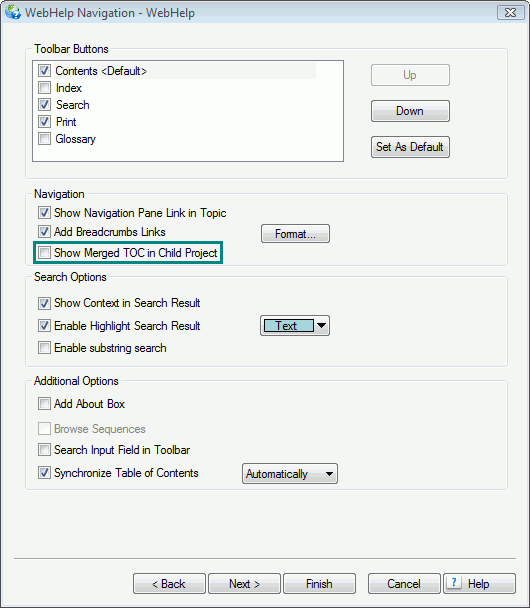 One useful change here. Often people create a direct call to a topic in a child project and the topic opens with the Show link. When they click that they see only the TOC for the child project; the expectation is that this topic is part of a merge so they will see the full TOC with all the projects. Now there is a check box so that the full TOC will display.