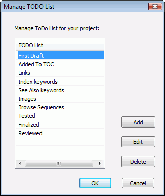 RoboHelp 8 introduces the ability to change the names of the default To Do items, add your own and delete items. Now the list can just show what works for you.