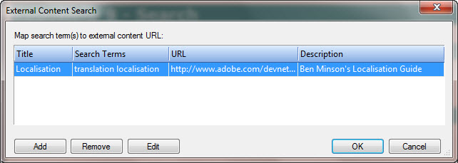 Let's assume a user is searching for information on translation. In addition to anything I include in the help, I might want them to be aware of Ben Minson's excellent article on the subject. I want this included in the search results if they search on translation or on localisation so I add the search above.