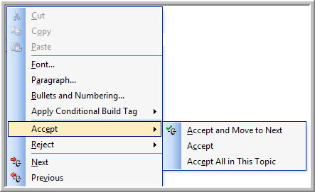 You can work through the topics and use the main menu or the context menu or accept / reject the changes. I found Accept and Move to Next did not always work as expected. In the example above after accepting the deletion of the first 32, I expected to move to the first 16. Instead it moved to the second 32, then back to the first 16.