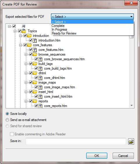 For reviews by SMEs and others who do not have Adobe RoboHelp 9, you can create a PDF review. Exactly how this works will depend on whether or not you have Technical Communication Suite with Acrobat Pro X, Acrobat Pro X as a standalone product or Acrobat Pro 9. The PDF Add-in is not sufficient, you must have one of the compatible full versions of Acrobat.